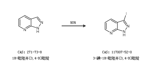 1.通過1H-吡唑并[3,4-B]吡啶合成3-碘-1H-吡唑并[3,4-B]吡啶,收率約90%;