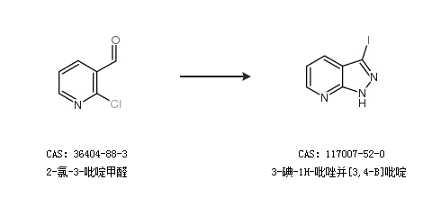 2.通過2-氯-3-吡啶甲醛合成3-碘-1H-吡唑并[3,4-B]吡啶