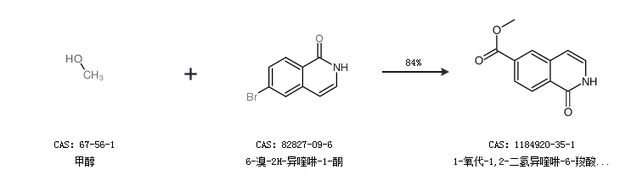 1.通過(guò)甲醇和6-溴-2H-異喹啉-1-酮合成1-氧代-1,2-二氫異喹啉-6-羧酸甲酯,收率約84%;