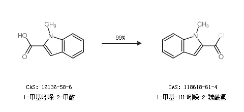 1.通過(guò)1-甲基吲哚-2-甲酸合成1-甲基-1H-吲哚-2-羰酰氯,收率約99%;