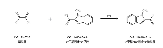 2.通過(guò)草酰氯和1-甲基吲哚-2-甲酸合成1-甲基-1H-吲哚-2-羰酰氯,收率約98%;