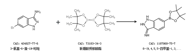 1.通過3-氨基-6-溴-1H-吲唑和聯(lián)硼酸頻那醇酯合成6-(4,4,5,5-四甲基-1,3,2-二氧雜環(huán)己硼烷-2-基)-3-氨基-1H-吲唑