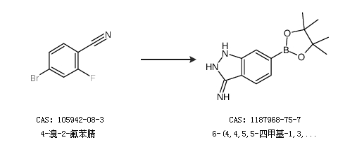 2.通過4-溴-2-氟苯腈合成6-(4,4,5,5-四甲基-1,3,2-二氧雜環(huán)己硼烷-2-基)-3-氨基-1H-吲唑