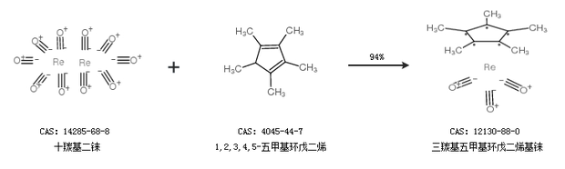 1.通過十羰基二錸和1,2,3,4,5-五甲基環(huán)戊二烯合成三羰基五甲基環(huán)戊二烯基錸,收率約94%;