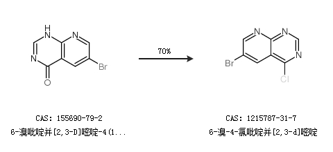 1.通過6-溴吡啶并[2,3-D]嘧啶-4(1H)-酮合成6-溴-4-氯吡啶并[2,3-d]嘧啶,收率約70%;