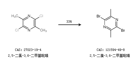 1.通過(guò)2,5-二氯-3,6-二甲基吡嗪合成2,5-二溴-3,6-二甲基吡嗪,收率約33%;