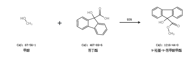 1.通過甲醇和芴丁酯合成9-羥基-9-芴甲酸甲酯,收率約93%;