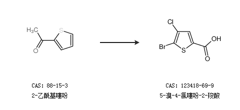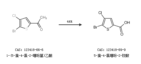 1.通過1-(5-溴-4-氯-2-噻吩基)乙酮合成5-溴-4-氯噻吩-2-羧酸,收率約44%;