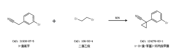 2.通過3-溴氰芐和二溴乙烷合成1-(3-溴-苯基)-環(huán)丙烷甲腈,收率約92%;