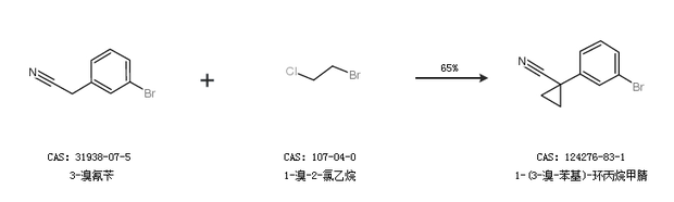 1.通過3-溴氰芐和1-溴-2-氯乙烷合成1-(3-溴-苯基)-環(huán)丙烷甲腈,收率約65%;