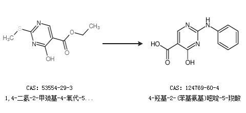 1.通過1,4-二氫-2-甲巰基-4-氧代-5-嘧啶甲酸乙酯合成4-羥基-2-(苯基氨基)嘧啶-5-羧酸