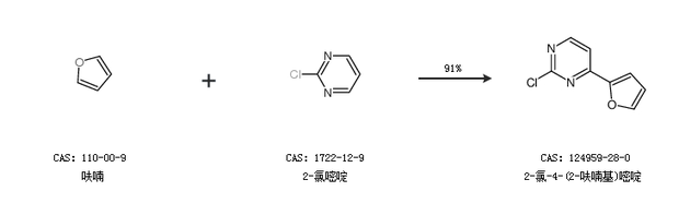 2.通過呋喃和2-氯嘧啶合成2-氯-4-(2-呋喃基)嘧啶,收率約91%;