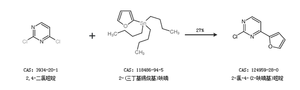 1.通過2,4-二氯嘧啶和2-(三丁基錫烷基)呋喃合成2-氯-4-(2-呋喃基)嘧啶,收率約27%;