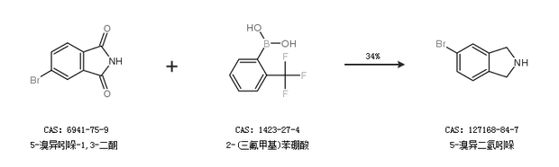 2.通過5-溴異吲哚-1,3-二酮和2-(三氟甲基)苯硼酸合成5-溴異二氫吲哚,收率約34%;