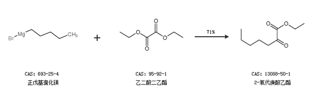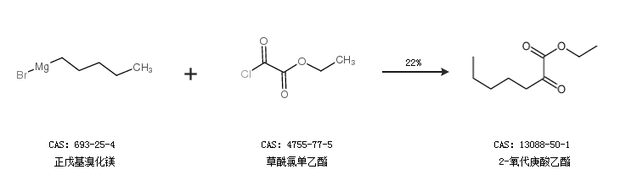 1.通過正戊基溴化鎂和草酰氯單乙酯合成2-氧代庚酸乙酯,收率約22%;