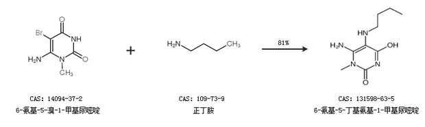 1.通過6-氨基-5-溴-1-甲基尿嘧啶和正丁胺合成6-氨基-5-丁基氨基-1-甲基尿嘧啶,收率約81%;