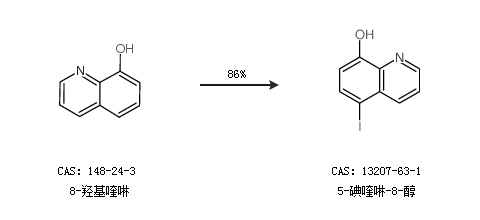 2.通過8-羥基喹啉合成5-碘喹啉-8-醇,收率約86%;