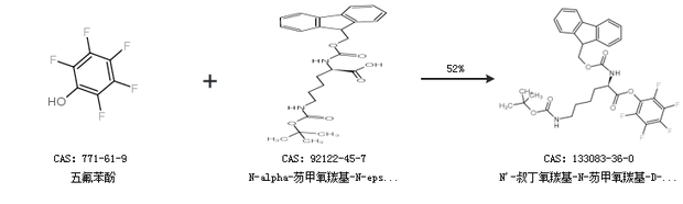 1.通過(guò)五氟苯酚和N-alpha-芴甲氧羰基-N-epsilon-叔丁氧羰基-D-賴(lài)氨酸合成N''-叔丁氧羰基-N-芴甲氧羰基-D-賴(lài)氨酸五氟苯基酯,收率約52%;