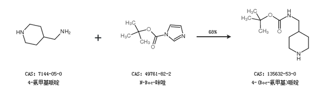 1.通過4-氨甲基哌啶和N-Boc-咪唑合成4-(Boc-氨甲基)哌啶,收率約68%;