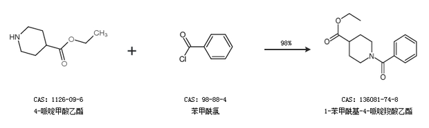 1.通過4-哌啶甲酸乙酯和苯甲酰氯合成1-苯甲酰基-4-哌啶羧酸乙酯,收率約98%;