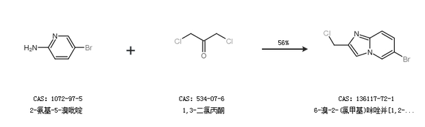 1.通過(guò)2-氨基-5-溴吡啶和1,3-二氯丙酮合成6-溴-2-(氯甲基)咪唑并[1,2-a]吡啶,收率約56%;