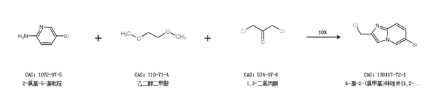2.通過(guò)2-氨基-5-溴吡啶、乙二醇二甲醚和1,3-二氯丙酮合成6-溴-2-(氯甲基)咪唑并[1,2-a]吡啶,收率約10%;