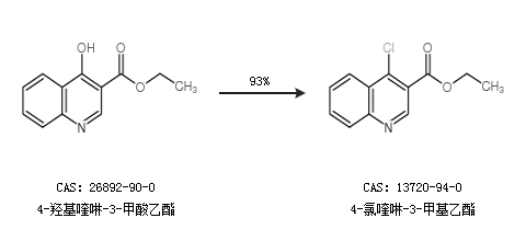 1.通過4-羥基喹啉-3-甲酸乙酯合成4-氯喹啉-3-甲基乙酯,收率約93%;