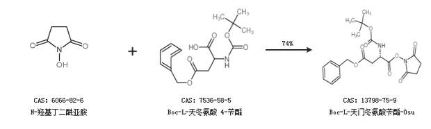 1.通過N-羥基丁二酰亞胺和Boc-L-天冬氨酸 4-芐酯合成Boc-L-天門冬氨酸芐酯-Osu,收率約74%;