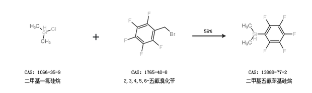 1.通過二甲基一氯硅烷和2,3,4,5,6-五氟溴化芐合成二甲基五氟苯基硅烷,收率約56%;