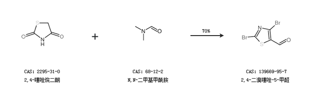 1.通過2,4-噻唑烷二酮和N,N-二甲基甲酰胺合成2,4-二溴噻唑-5-甲醛,收率約70%;