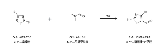 2.通過2,4-二溴噻唑和N,N-二甲基甲酰胺合成2,4-二溴噻唑-5-甲醛,收率約35%;