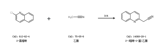 2.通過2-氯喹啉和乙腈合成2-(喹啉-2-基)乙腈,收率約31%;
