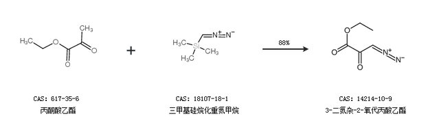 2.通過丙酮酸乙酯和三甲基硅烷化重氮甲烷合成3-二氮雜-2-氧代丙酸乙酯,收率約88%;