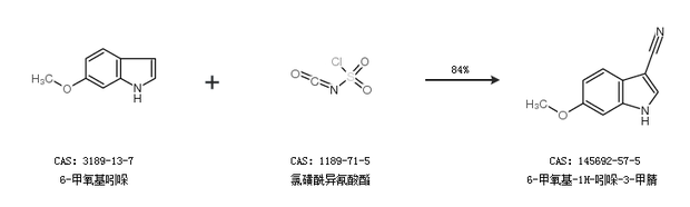 1.通過6-甲氧基吲哚和氯磺酰異氰酸酯合成6-甲氧基-1H-吲哚-3-甲腈,收率約84%;