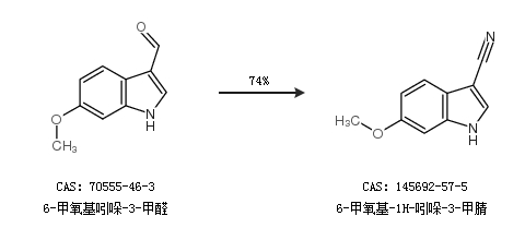 2.通過6-甲氧基吲哚-3-甲醛合成6-甲氧基-1H-吲哚-3-甲腈,收率約74%;