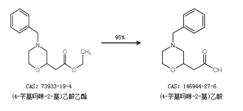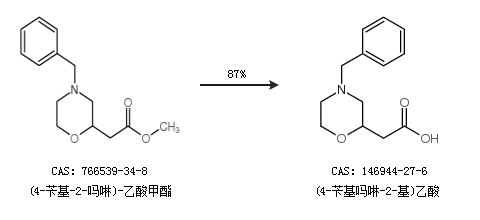 2.通過(guò)(4-芐基嗎啉-2-基)乙酸乙酯合成(4-芐基嗎啉-2-基)乙酸,收率約95%;