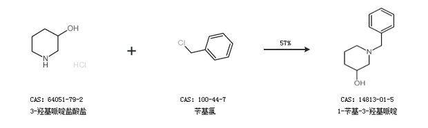 2.通過(guò)3-羥基哌啶鹽酸鹽和芐基氯合成1-芐基-3-羥基哌啶,收率約57%;