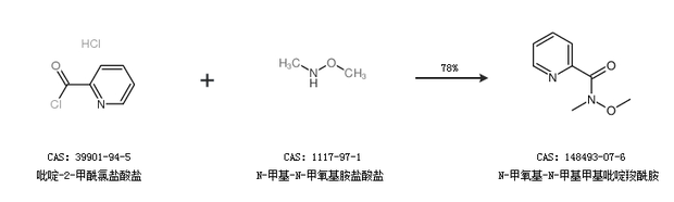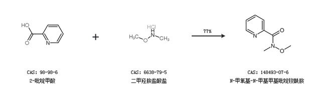 1.通過2-吡啶甲酸和二甲羥胺鹽酸鹽合成N-甲氧基-N-甲基甲基吡啶羧酰胺,收率約77%;