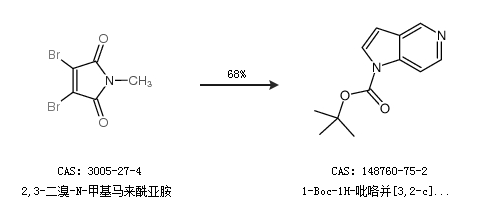 2.通過2,3-二溴-N-甲基馬來酰亞胺合成1-Boc-1H-吡咯并[3,2-c]吡啶,收率約68%;