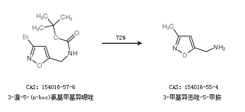 1.通過3-溴-5-(n-boc)氨基甲基異噁唑合成3-甲基異惡唑-5-甲胺,收率約72%;