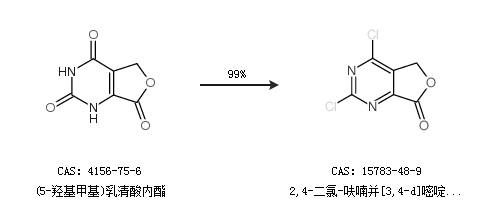 1.通過(5-羥基甲基)乳清酸內(nèi)酯合成2,4-二氯-呋喃并[3,4-d]嘧啶-7(5h)-酮,收率約99%;