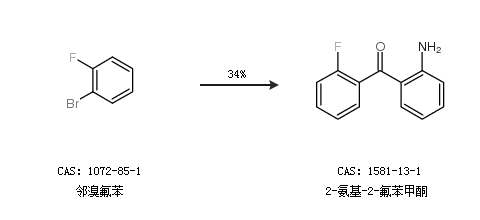 1.通過鄰溴氟苯合成2-氨基-2-氟苯甲酮,收率約34%;