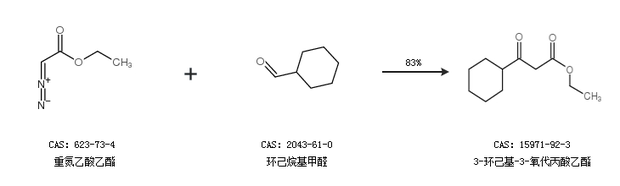 1.通過重氮乙酸乙酯和環(huán)己烷基甲醛合成3-環(huán)己基-3-氧代丙酸乙酯,收率約83%;