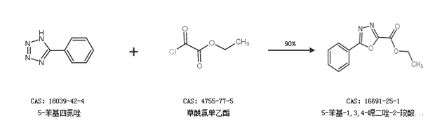 1.通過(guò)5-苯基四氮唑和草酰氯單乙酯合成5-苯基-1,3,4-噁二唑-2-羧酸乙酯,收率約90%;