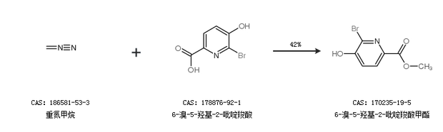 2.通過重氮甲烷和6-溴-5-羥基-2-吡啶羧酸合成6-溴-5-羥基-2-吡啶羧酸甲酯,收率約42%;