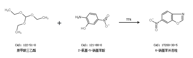 1.通過原甲酸三乙酯和2-氨基-5-硝基苯酚合成6-硝基苯并惡唑,收率約77%;