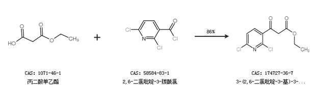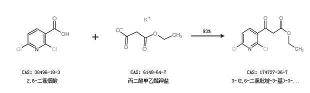 2.通過2,6-二氯煙酸和丙二酸單乙酯鉀鹽合成3-(2,6-二氯吡啶-3-基)-3-氧代丙酸乙酯,收率約93%;