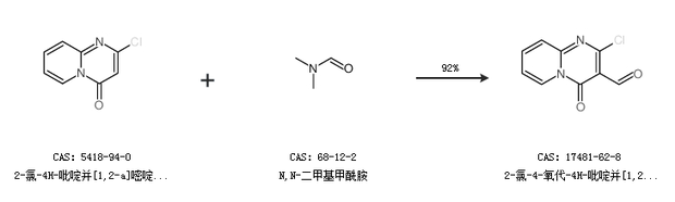 2.通過2-氯-4H-吡啶并[1,2-a]嘧啶-4-酮和N,N-二甲基甲酰胺合成2-氯-4-氧代-4H-吡啶并[1,2-a]嘧啶-3-甲醛,收率約92%;