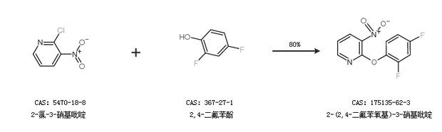 1.通過2-氯-3-硝基吡啶和2,4-二氟苯酚合成2-(2,4-二氟苯氧基)-3-硝基吡啶,收率約80%;