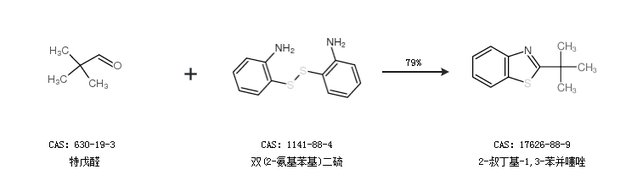 2.通過特戊醛和雙(2-氨基苯基)二硫合成2-叔丁基-1,3-苯并噻唑,收率約79%;